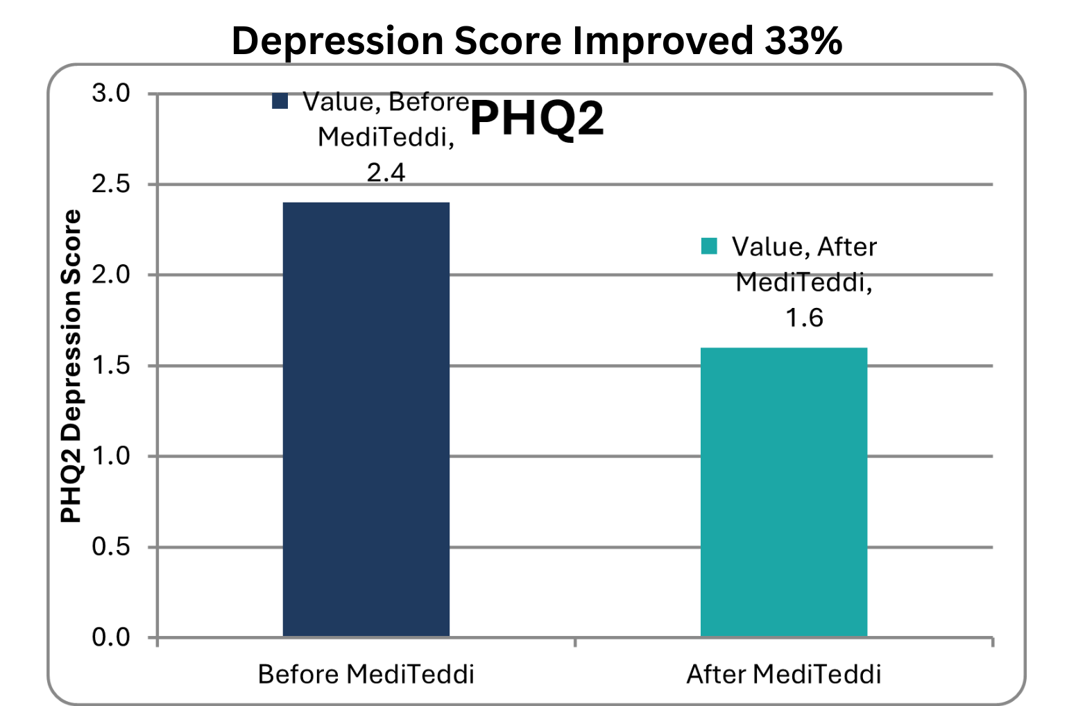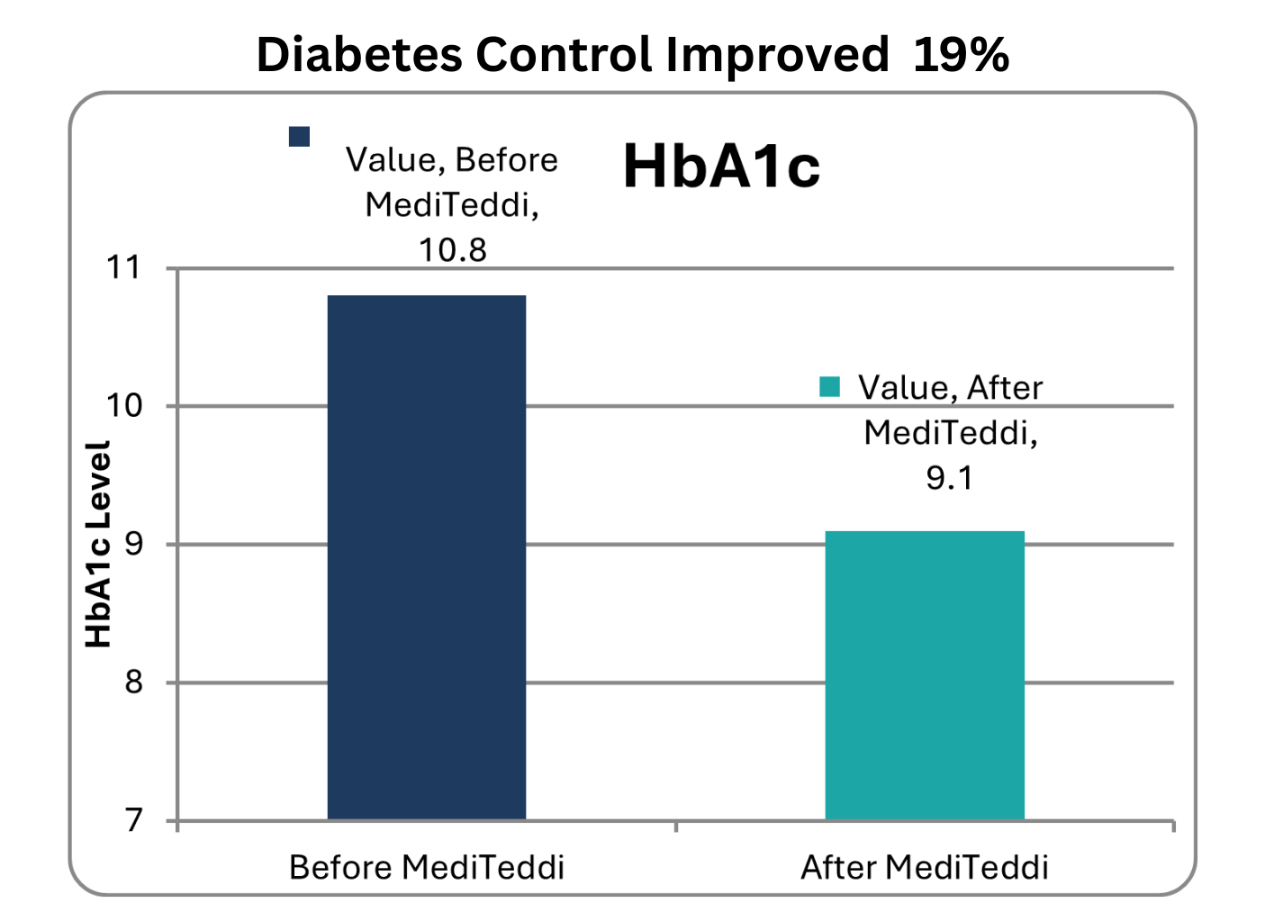 Patients in our program who maintain their improved HbA1c levels will gain on average 5–10 additional years of life and experience 30% fewer hospitalizations. Just as importantly, depression scores improved as much as they typically do with medication—without side effects—and several patients were able to stop taking antidepressants after using MediTeddi.